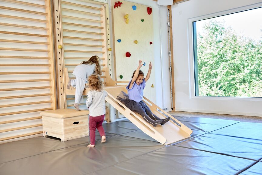 Unsere Neigbaren Sprossenwände werden mit einem lichten Sprossenabstand von 79mm hergestellt und sind damit auch für die Nutzung mit U3-Kindern geeignet. Die Benutzung muss dennoch stets beaufsichtigt werden.